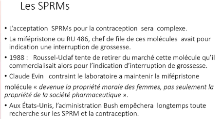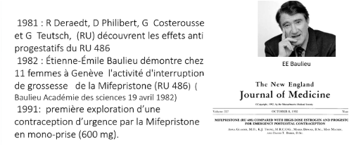 Les recherches du Dr E.E. Baulieu sur les antiprogestatifs ou Modulateurs sélectifs du Récepteur de la Progesterone (mifépristone RU486) ouvrent une nouvelle étape dans l’interruption volontaire de grossesse, non sans fortes résistances politiques et idéologiques, notamment aux États-Unis.