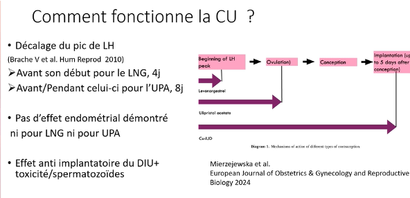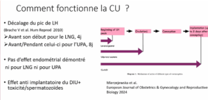 Sur le plan physiologique, ces méthodes agissent principalement en retardant l’ovulation, sans preuve solide d’un effet sur l’implantation embryonnaire lorsqu’elles sont prises sur une courte durée. Le DIU reste la méthode la plus efficace en contraception d’urgence, avec l’avantage d’offrir une contraception de long terme immédiate. A noter que l’UPA peut voir son efficacité diminuée si prise d’une contraception progestative juste après.