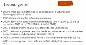 L’ulipristal acétate, UPA, (EllaOne), mis sur le marché en 2009, représente aujourd’hui une avancée majeure grâce à une fenêtre d’efficacité plus large que le lévonorgestrel, LNG. En 2015 sa délivrance a lieu sans prescription, anonyme et gratuite pour les jeunes filles mineures dans les pharmacies et les CPEF.