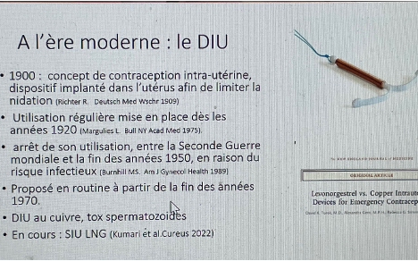 À l’époque moderne, des méthodes agressives et dangereuses (injections intravaginales de substances corrosives) ont précédé l’arrivée des dispositifs intra-utérins (DIU). Dès 1900, le principe du DIU est développé, mais son usage est freiné par des craintes infectieuses, qui subsistent encore de nos jours, et des contextes géopolitiques (notamment après la Seconde Guerre mondiale). Le DIU au cuivre s’impose progressivement à partir des années 1950–1970. Il n’a été indiqué chez les nulligestes que seulement il y a une vingtaine d’années. Il agit à la fois par toxicité pour les spermatozoïdes et, dans une moindre mesure, par un effet anti-nidatoire. Son utilisation comme contraception d’urgence reste cependant associée à des débats éthiques de méthode dite de contragestion.