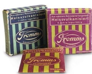 C'est finalement en 1912 qu’un Polonais Israël Fromm apporte la dernière touche à ce monument de l'inventivité humaine. En fournissant notamment l'armée allemande lors de la 1ère guerre mondiale. Son slogan est vendeur : « La concurrence crève ». Comme Goodyear, il décide d'utiliser du latex mais pour l'amincir, il le liquéfie en le mélangeant avec de l'essence, et y trempe des formes phalliques. Il ne reste plus qu'à les enrouler. A partir de 1914, Fromm développe sa production dans son Fromm Act Gummiwerke Company Ltd et rencontre un franc succès.